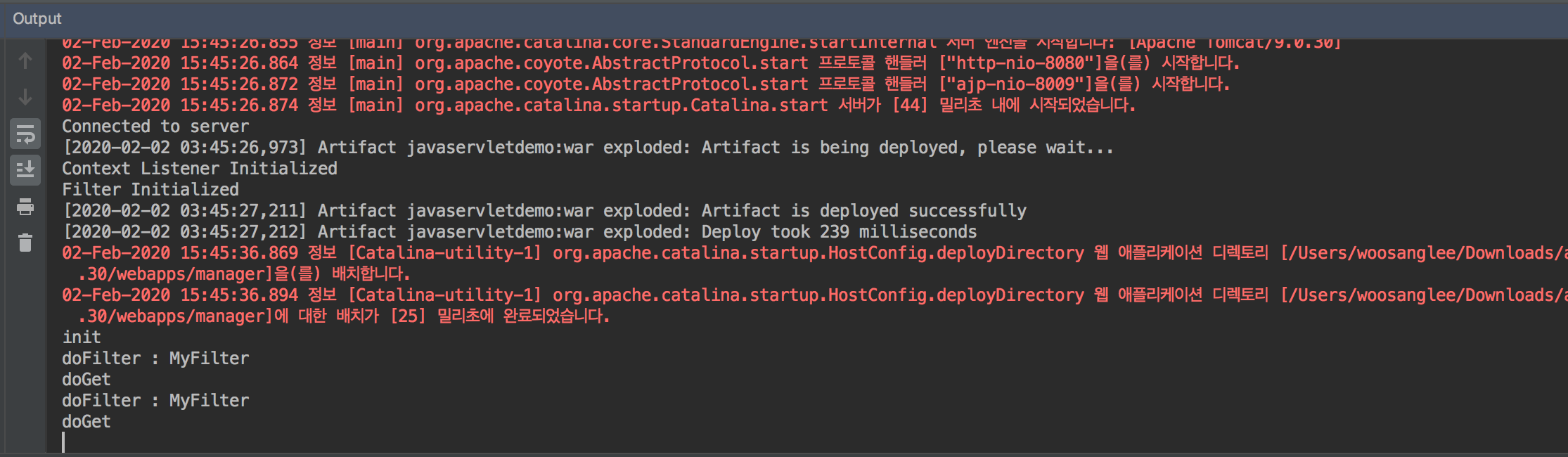 - 아래와 같이 , Context Listener Init과 Filter Init은 호출이 없어도 먼저 호출된다. 해당 이유는 Init 할때 오래 걸릴 수 있는 시간을 미리 1회 호출해 둠으로써 Init 과정을 완료시켜버린다. 이를 '웜업' 이라고 한다.